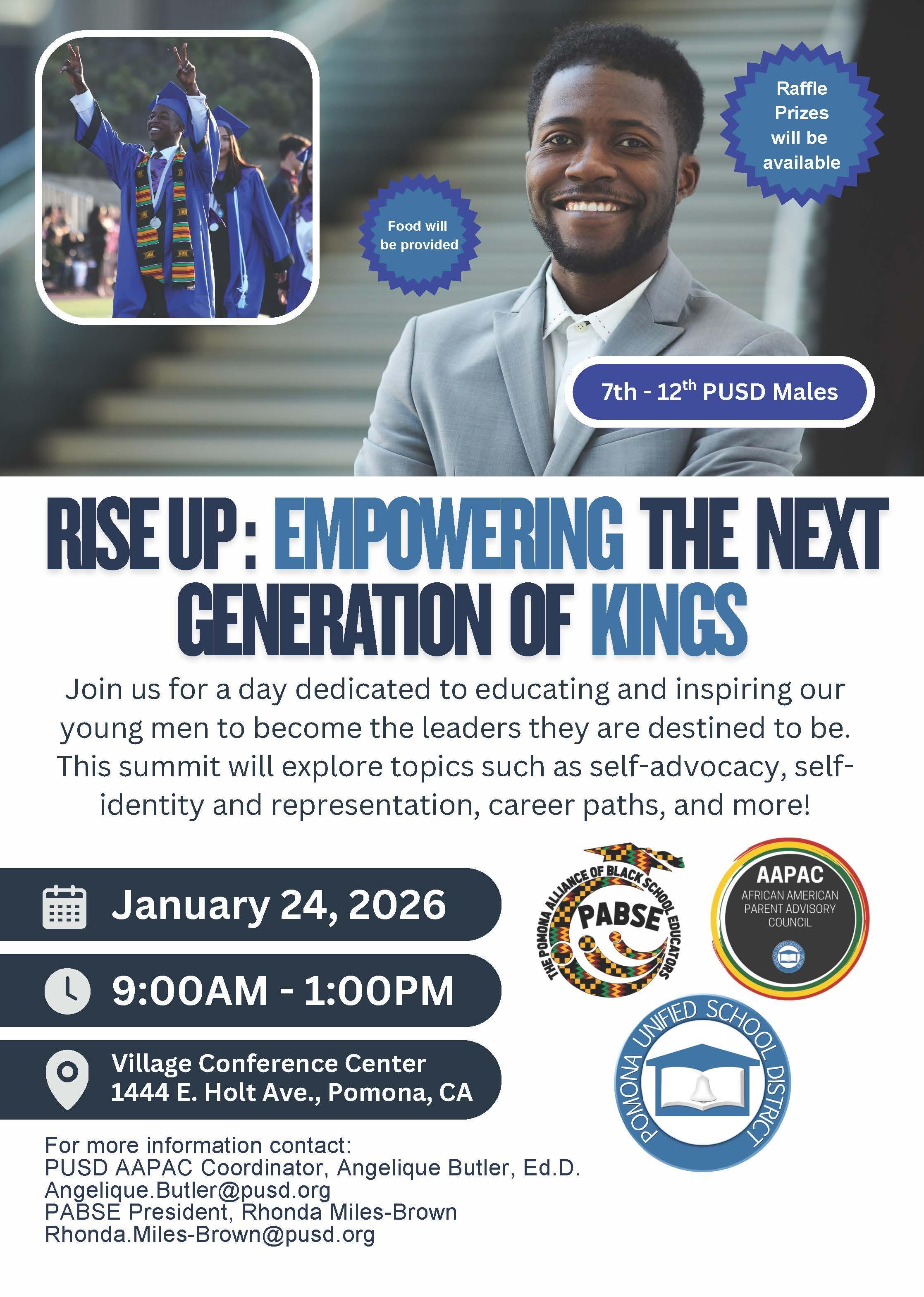 PABSE and AAPAC invite Pomona Unified male students (grades 7–12) to a powerful day of inspiration, leadership, and connection. Food will be provided, and Raffle Prizes will be available.